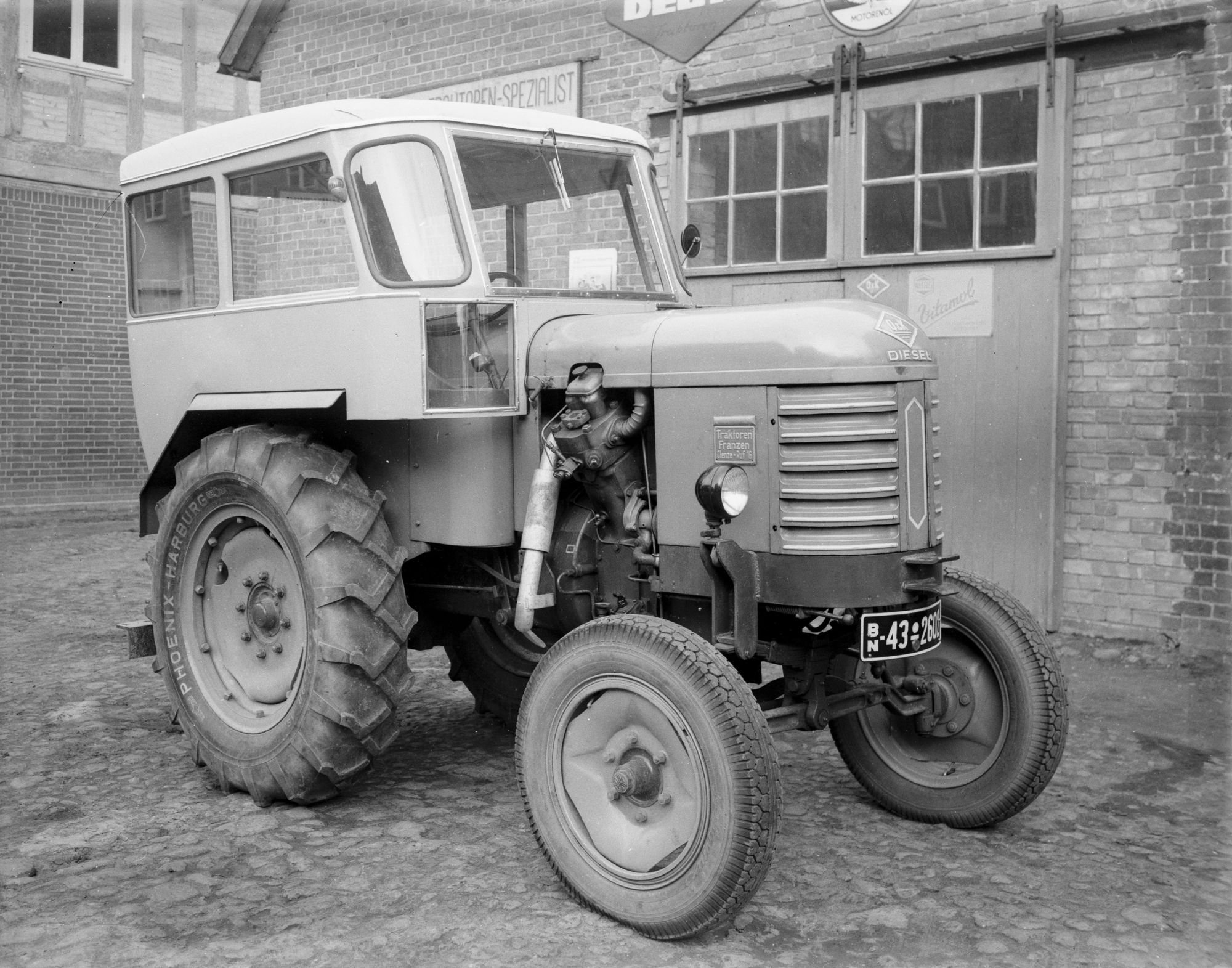 Das ist ein O&K Diesel Schlepper 32PS. Eine richtige Typenbezeichnung scheint es nicht gegeben zu haben. Gebaut wurden diese Schlepper ab ca. 1950 in Dortmund Dorstfeld. Der Schlepper besitzt einen V 2 Motor, ungewöhnlich in einem Traktor. Das geschlossene Fahrerhaus weist auf eine Nutzung im Speditiongewerbe hin, zb. Milchwagenfahrer oder Langholzfuhrbetrieb.