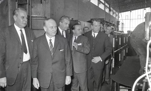 "IM SKF-WALZWERK: v. l. n. r. Direktor Brandin, Ministerpräsident Diederichs. Wirtschaftsminister Möller, Dipl. Kaufmann Günther und Auslandskorrespondent Günter Koch."