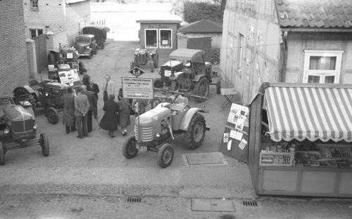 Hausaustellung bei Franzen in Clenze. Neben O&K Schleppern ( rechts im Bild, und hinten links) wurden auch Deutz Schlepper verkauft (vorne links). In Bildmitte vor dem Gemüseladen steht ein Normag Schlepper, gebaut von der Firma Normag aus Zorge im Harz.
