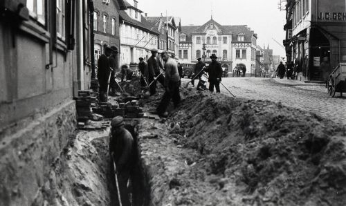 Rohrverlegung in der Marschtorstraße. Blick zum Markt mit Ratskeller.