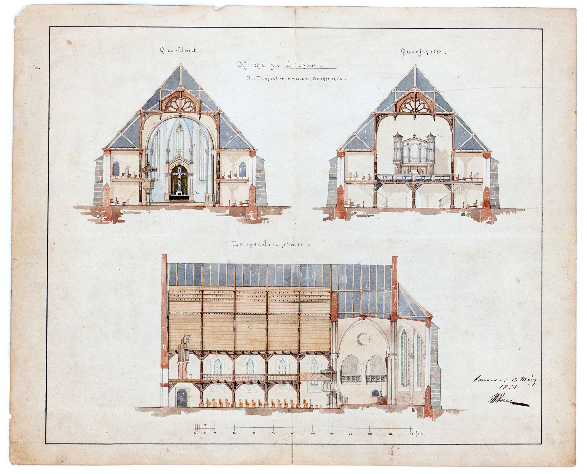 "Kirche zu Lüchow. Project mit neuem Dachstuhle - Längs- und Querschnitte"