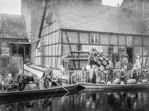 Das Foto stammt von dem Fotografen C. Fettback aus Salzwedel und zeigt die Rückseite der Firmengebäude in der Mauerstraße von der Mühlenjeetzel aus. Ein tolles Foto mit Jeetzelkähnen im Einsatz, das unter anderem auch für den Handwerksberuf des Böttchers stehen könnte. Eines der an der Hauswand gestapelten Fässer hat die Beschriftung 'Essig', auf einem anderen steht 'Rum'.