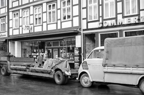Ein Firmenfahrzeug des Tischlers Karl Woizik parkt vor der Commerzbank. Dort wird umgebaut. Im Gebäude neben der Bank (Nr. 23) befinden sich die Geschäfte von Bodo Hahne, Buchhandlung (links) und Ritter & Kreisel, Spirituosen und Tabak (rechts), hier bereits zur Fa. Wolter, Mauerstraße 9, gehörig.